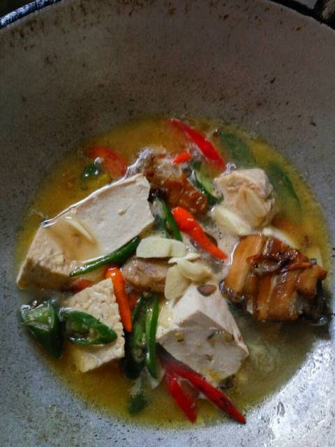 Panaskan minyak goreng, tumis semua bumbu iris sampai harum, masukkan tahu, tempe dan ikan pari, tambahkan secukupnya air, masak sampai 3/4 matang, tambahkan santan, garam dan gula, koreksi rata, biarkan matang sempurna