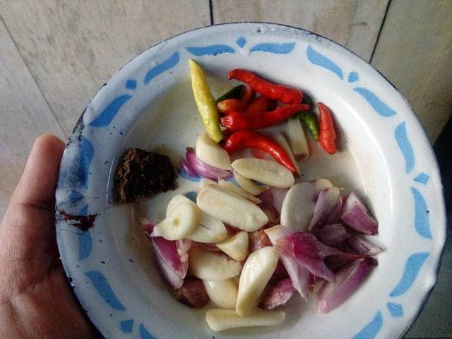 Iris2 bawang merah dan bawang putih, siapkan jg terasi dan cabe rawit